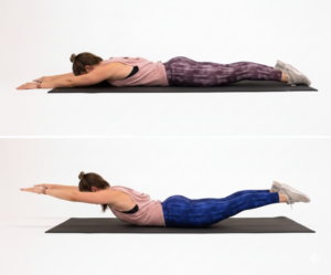 Lie face down, gently lift arms and legs off the floor while keeping the neck neutral.